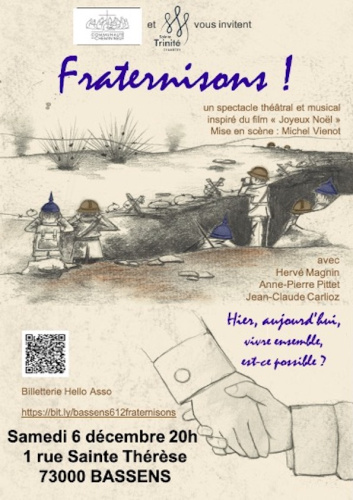 La compagnie « le Puits » vous propose un spectacle théâtral musical à Sainte Thérèse le samedi 6 décembre à 20h. Vous pouvez trouver la billetterie ici : https://bit.ly/bassens612fraternisons. Plus d’informations sur le site de la compagnie : https://www.compagnielepuits.com/fraternisons/.